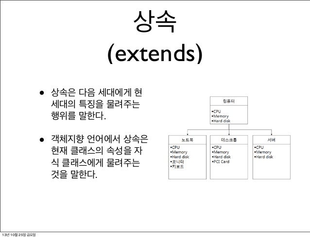 - 기존 클래스의 자산을 물려 받기 때문에 코드를 줄일 수 있다. ※부모 클래스의 코드를 변경하면 모든 자식클래스 적용
